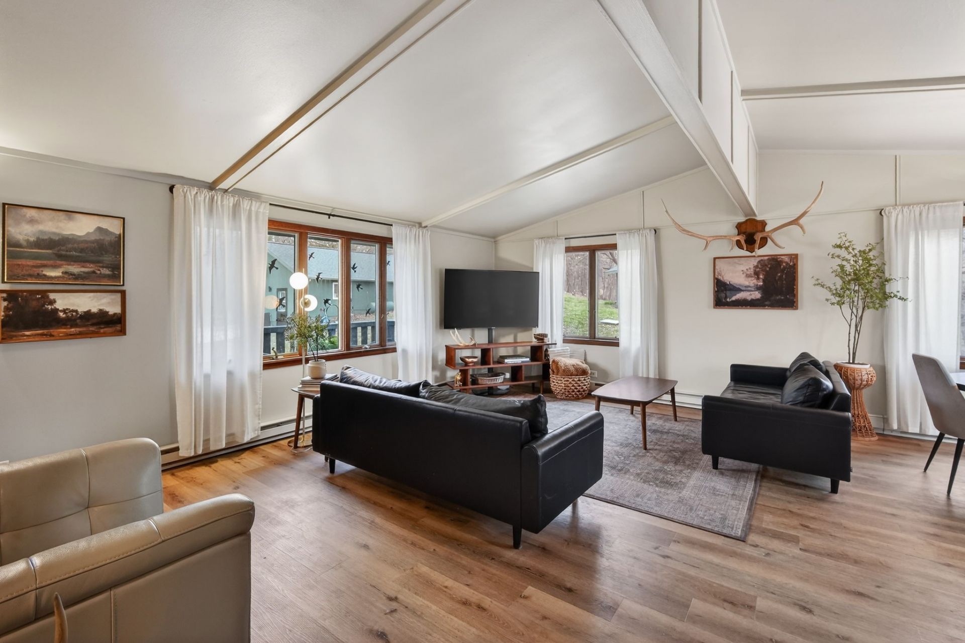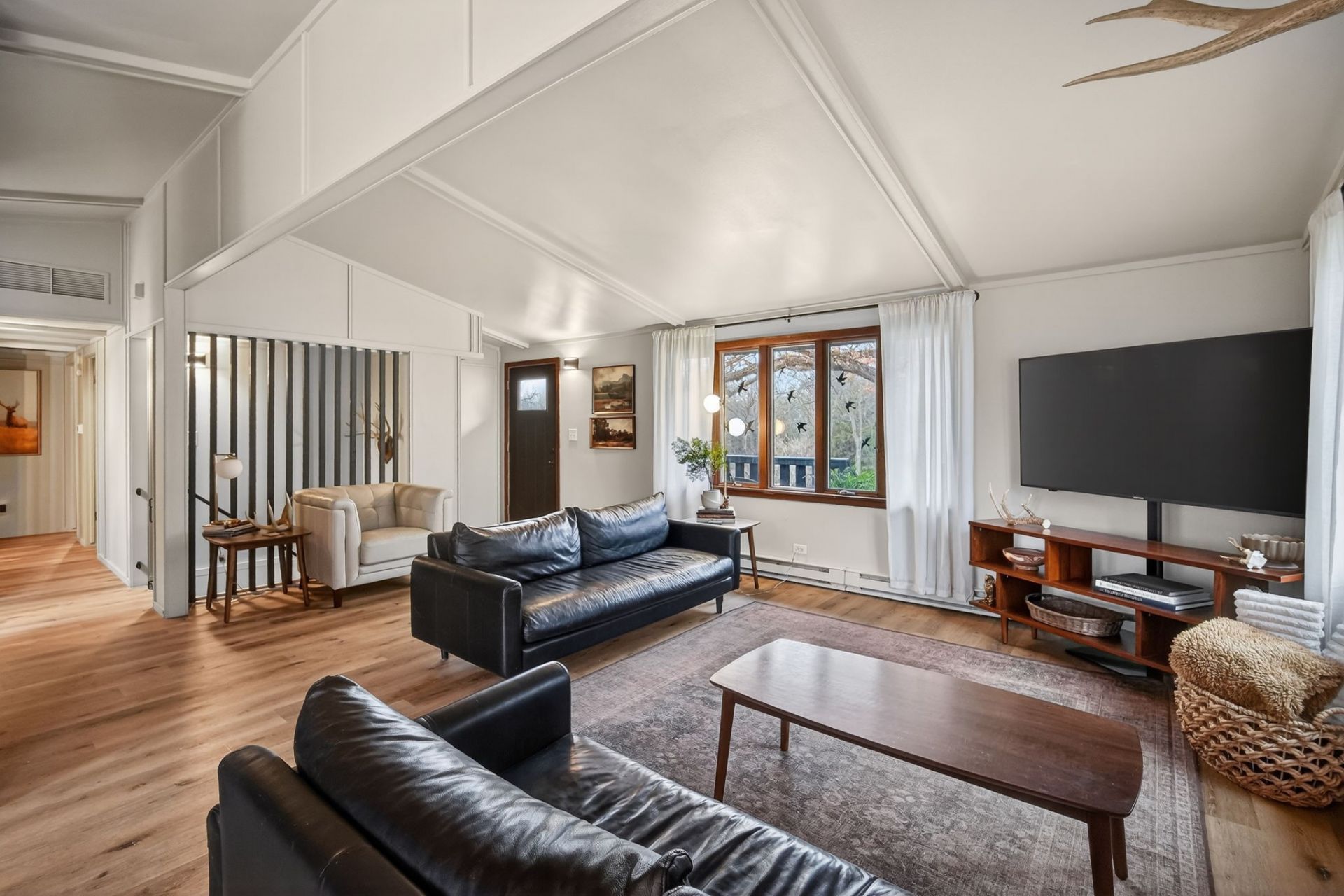 Tucked on the west side of Lake Panorama, this updated ranch-style offshore home offers privacy, space & modern updates. Set on a scenic 1.35-acre wooded lot, it provides a peaceful, secluded setting with mature trees & room to enjoy the outdoors. The main level features an inviting living room that flows seamlessly into the dining area, creating an open layout for everyday living & entertaining. The updated kitchen is equipped with quartz countertops, all-new appliances, & skylight that fills the space with natural light. The primary suite offers a spacious retreat with a well-appointed bathroom featuring a double vanity & three closets for ample storage. An additional bedroom & full bathroom on the main level provide convenient accommodations for family or guests. The fully finished walkout lower level expands the living space with multiple gathering areas, bar area, additional bedroom & ¾ bathroom. With direct access to both the driveway & backyard, the lower level is ideal for entertaining or flexible use. Surrounded by trees, the outdoor spaces are designed to take full advantage of the home's private setting. Enjoy the peaceful views from the front & back decks, relax on the patio, or gather around the firepit. Additional features include two storage sheds & oversized insulated garage, offering ample space for vehicles, storage, or hobbies. This property offers a quiet, wooded retreat while still providing access to all that Lake Panorama living has to offer.